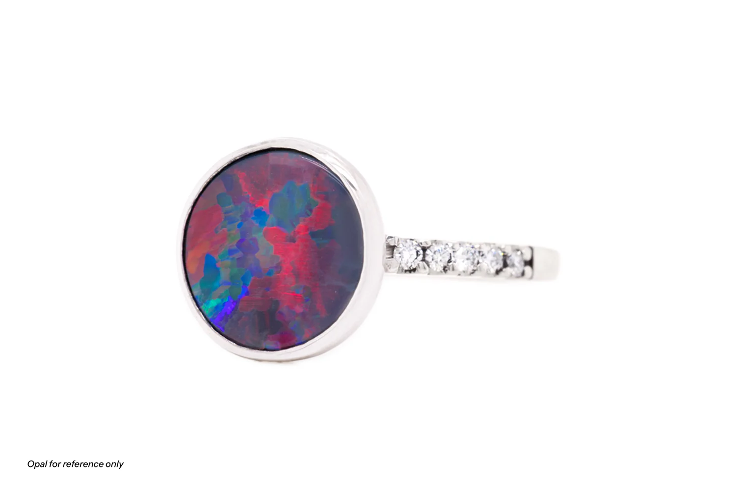 Designed as a modern take on a classic style, the Tatiana Ring with Diamonds exudes understated glamour and wearability. It’s the perfect heirloom piece, destined to be cherished and passed down through generations. Your chosen opal will be bezel set, complemented by 10 high-quality white diamonds claw set on the shoulders, totaling 0.15ct. The Tatiana Ring would make an exquisite engagement ring.